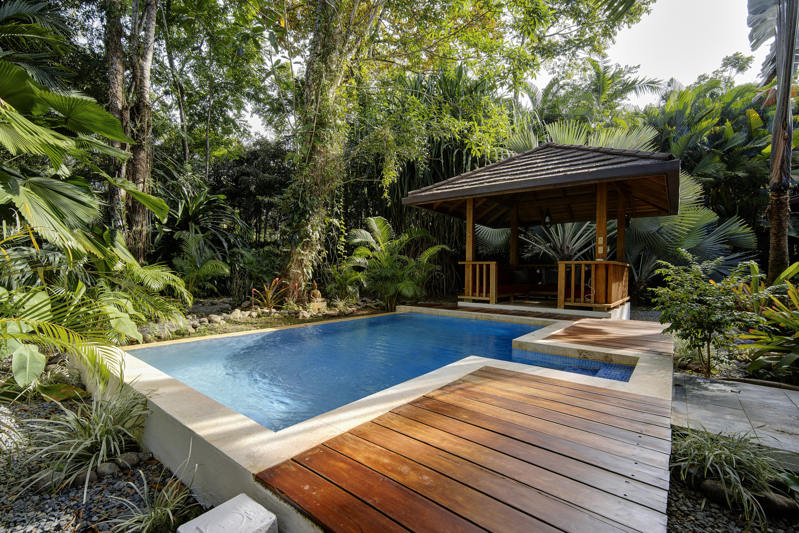Spacious wooden decks and a beautiful pool provide outdoor spaces for yoga, relaxation, or swimming amid lush greenery.